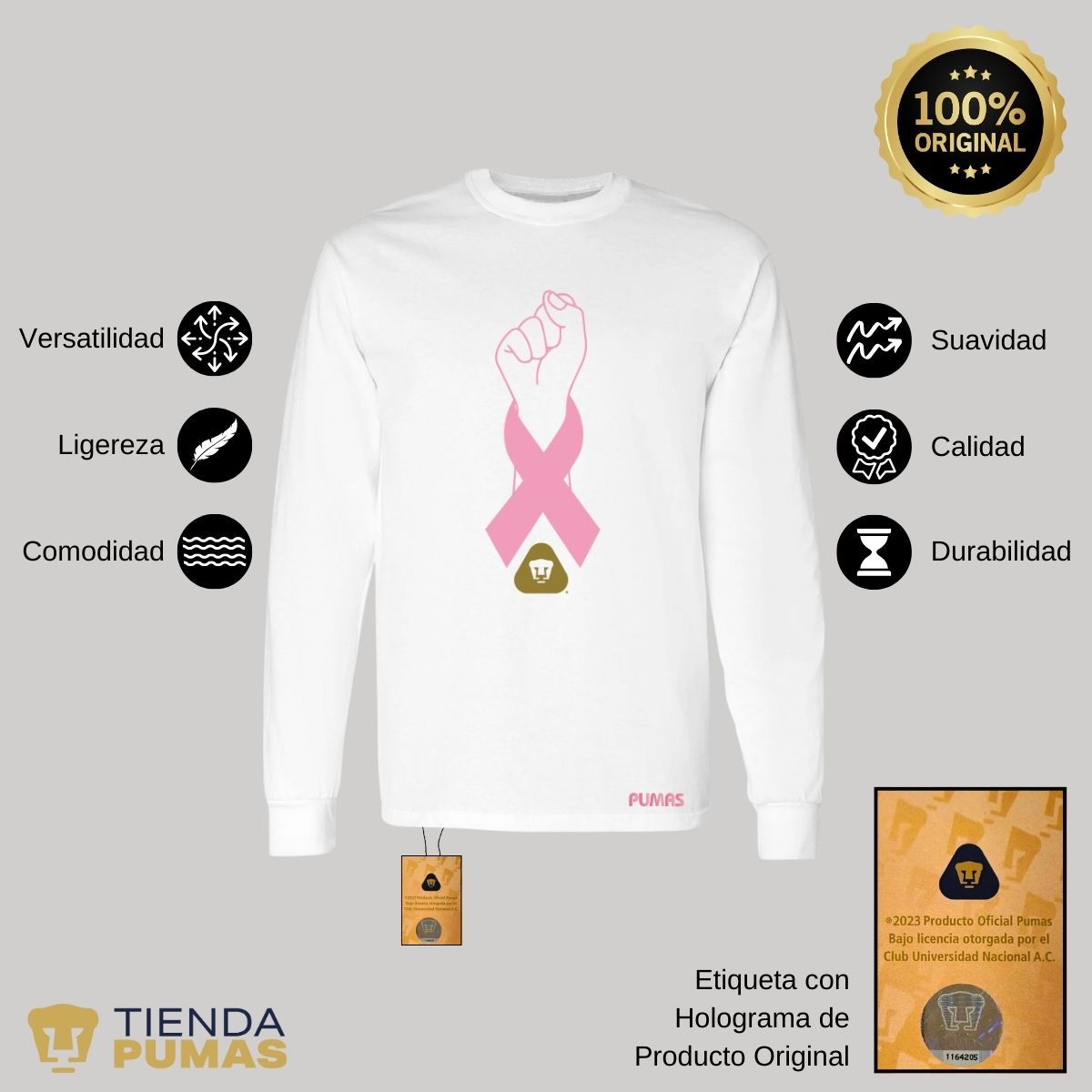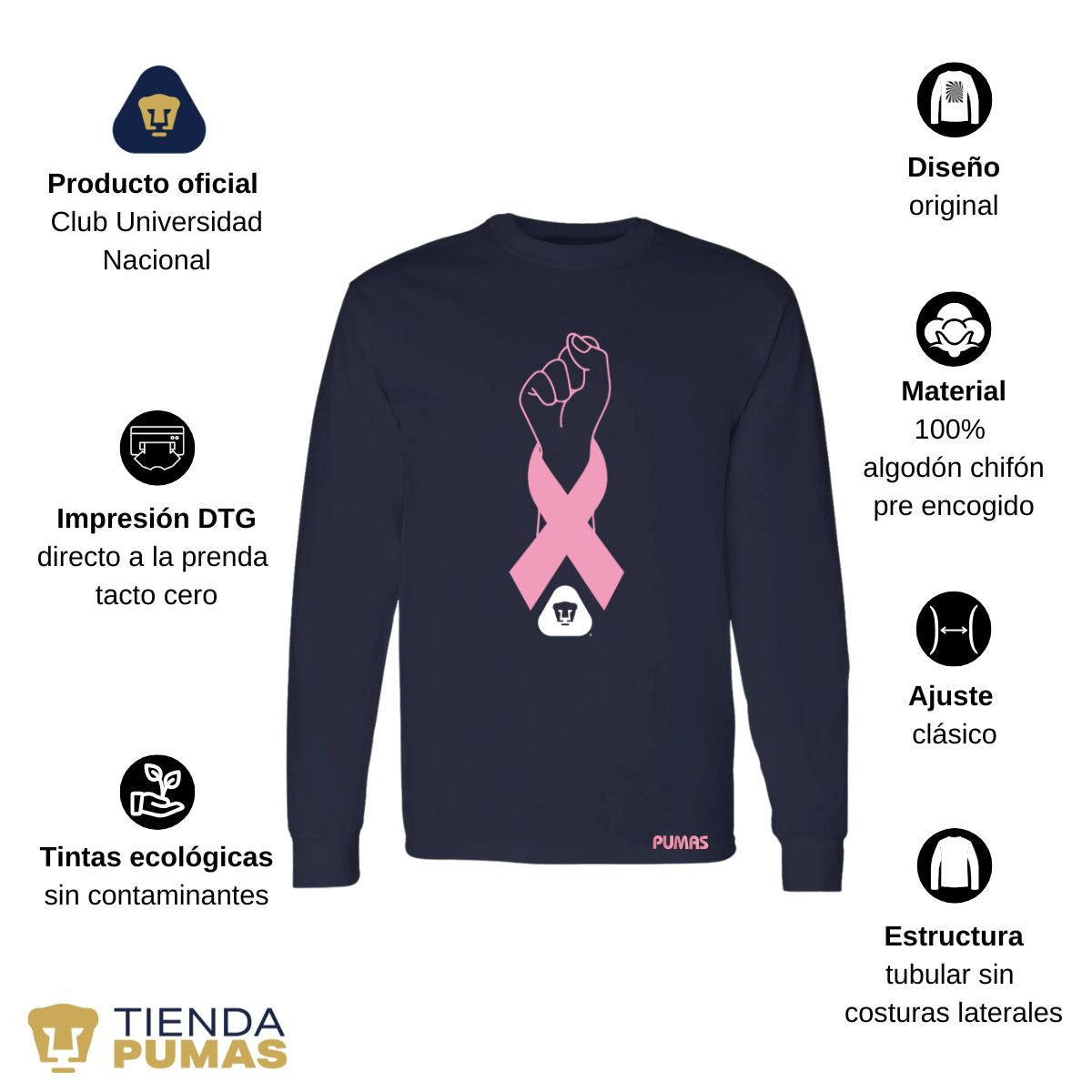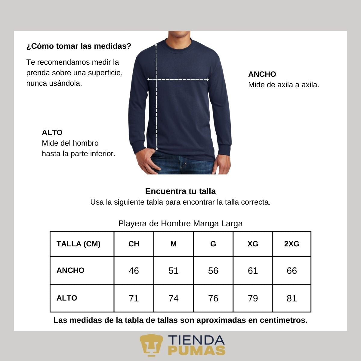 - ORIGINALIDAD Y SOSTENIBILIDAD: Playera de adulto de manga larga, Producto Oficial con un diseño original de Pumas UNAM impreso con tecnología DTG (directo a la prenda) tacto cero. Se utilizan tintas ecológicas sin contaminantes que se adhieren a las fibras de la ropa, garantizando calidad, colores vivos e imagen de larga duración en la camiseta sin comprometer el planeta. La playera cuenta además con etiqueta y holograma que garantiza un producto 100% original de Pumas UNAM.