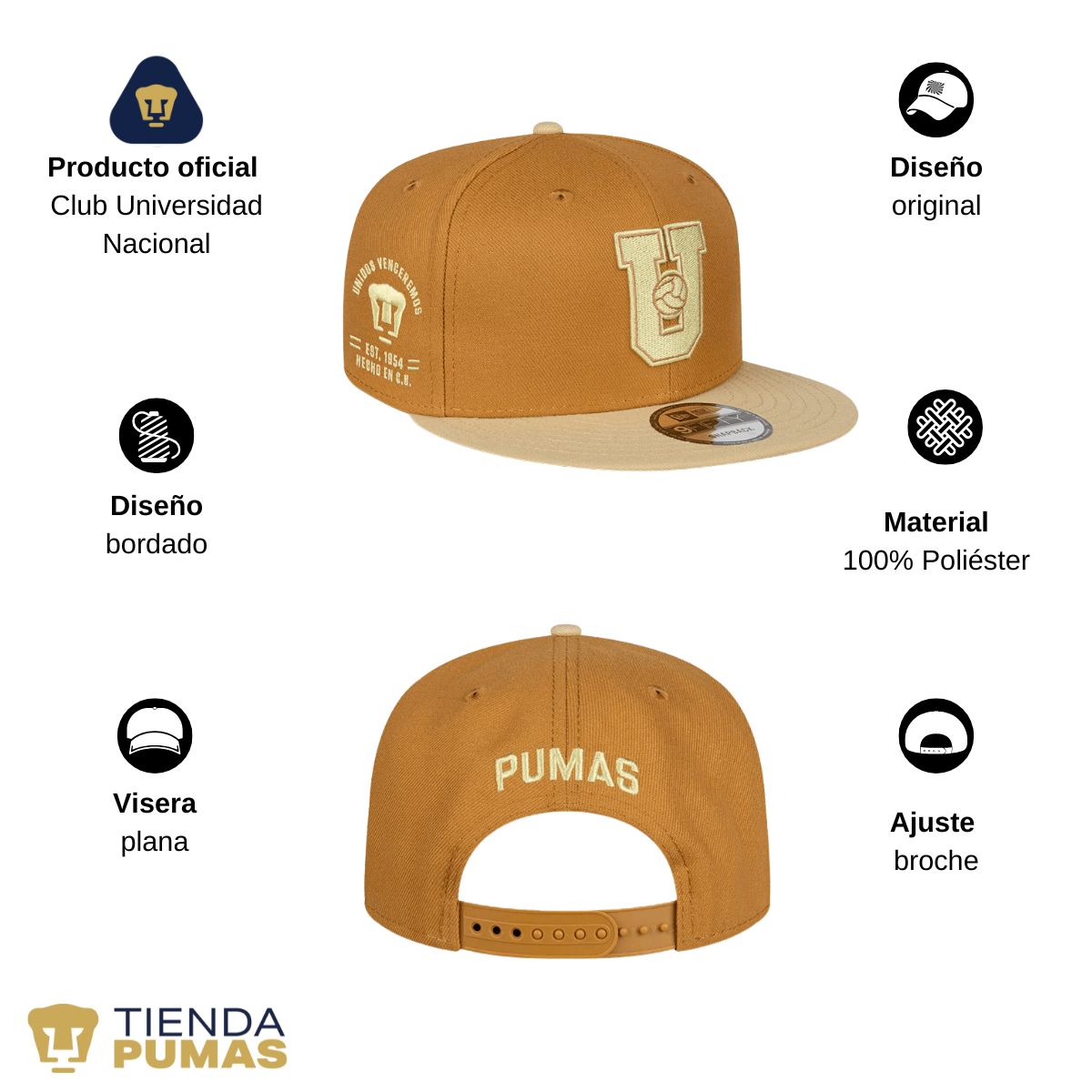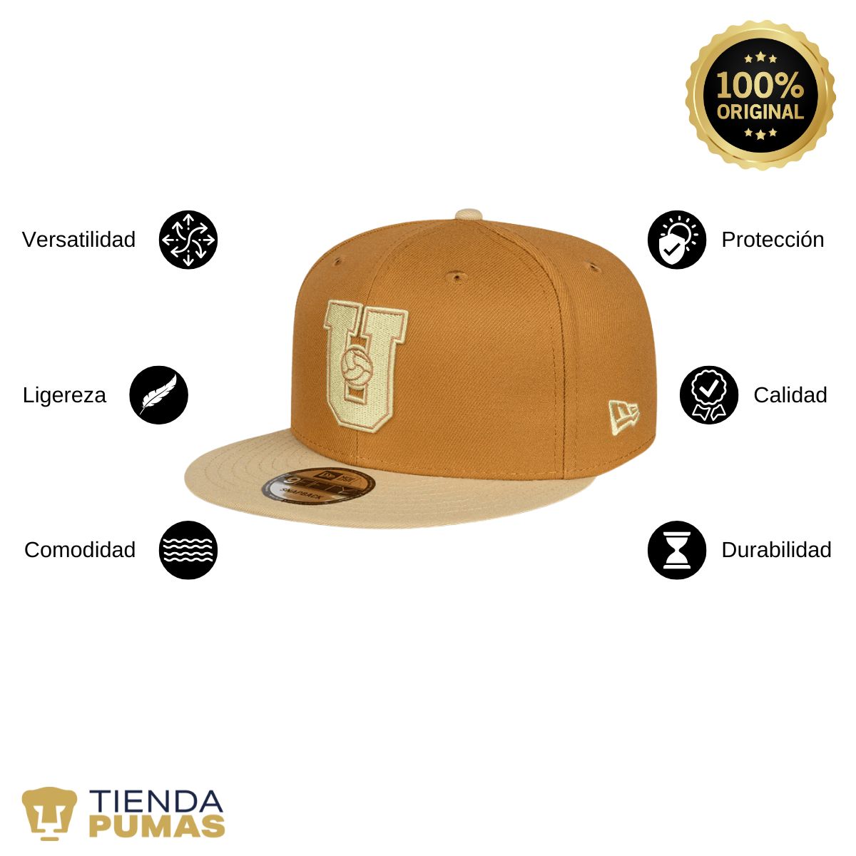 Gorra para adulto unitalla, 100% poliéster (ajuste con broche) con visera plana, unisex, hombre o mujer nueva New Era, diseño Bordado original , uso casual o deportiva. Colores de gorra: Cafe-Beige.