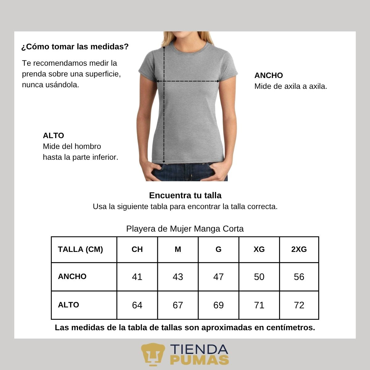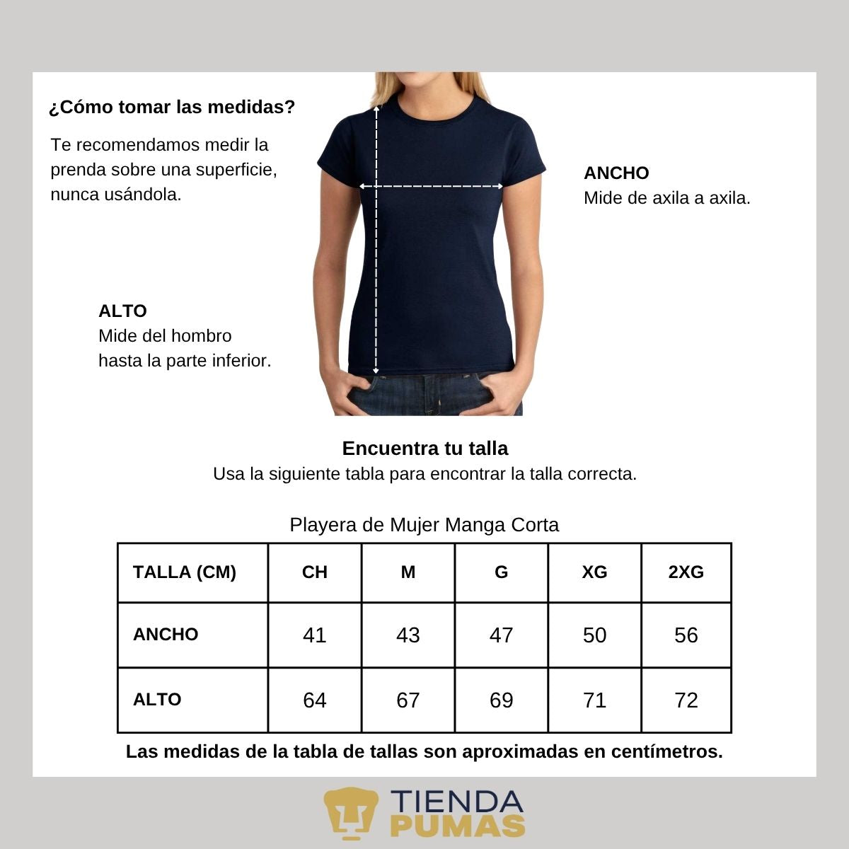 • ORIGINALIDAD: Playera de mujer manga corta, Producto Oficial con un diseño original de Pumas UNAM estampado en vinil textil. La playera cuenta además con etiqueta y holograma que la garantiza como producto 100% original de Pumas UNAM.