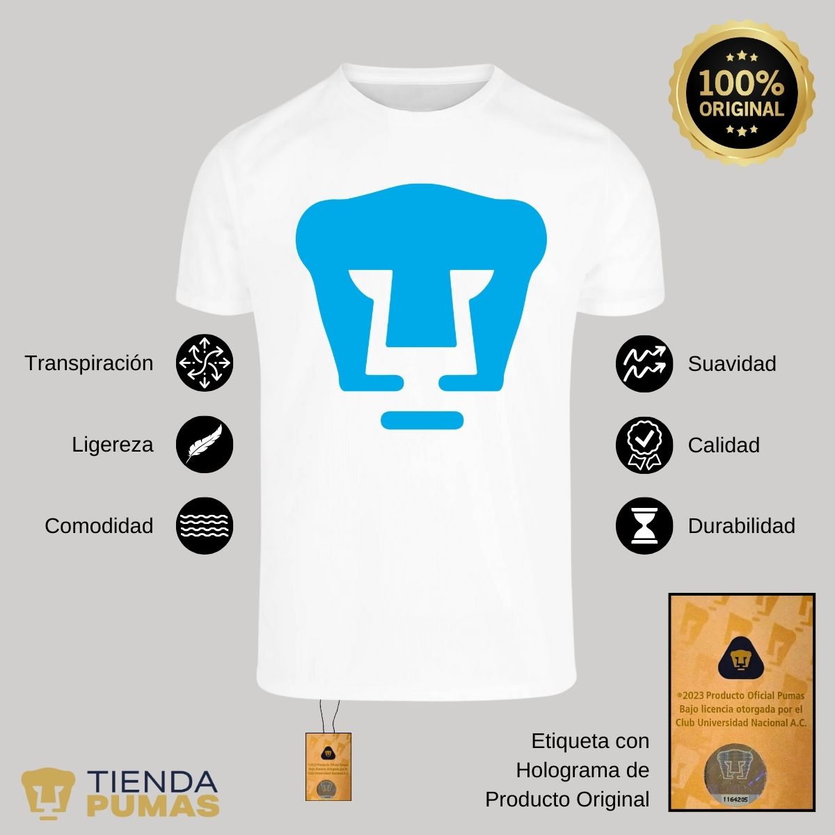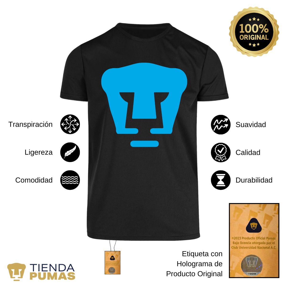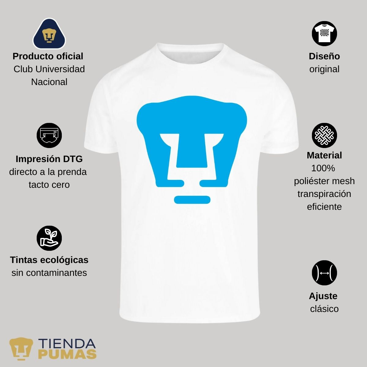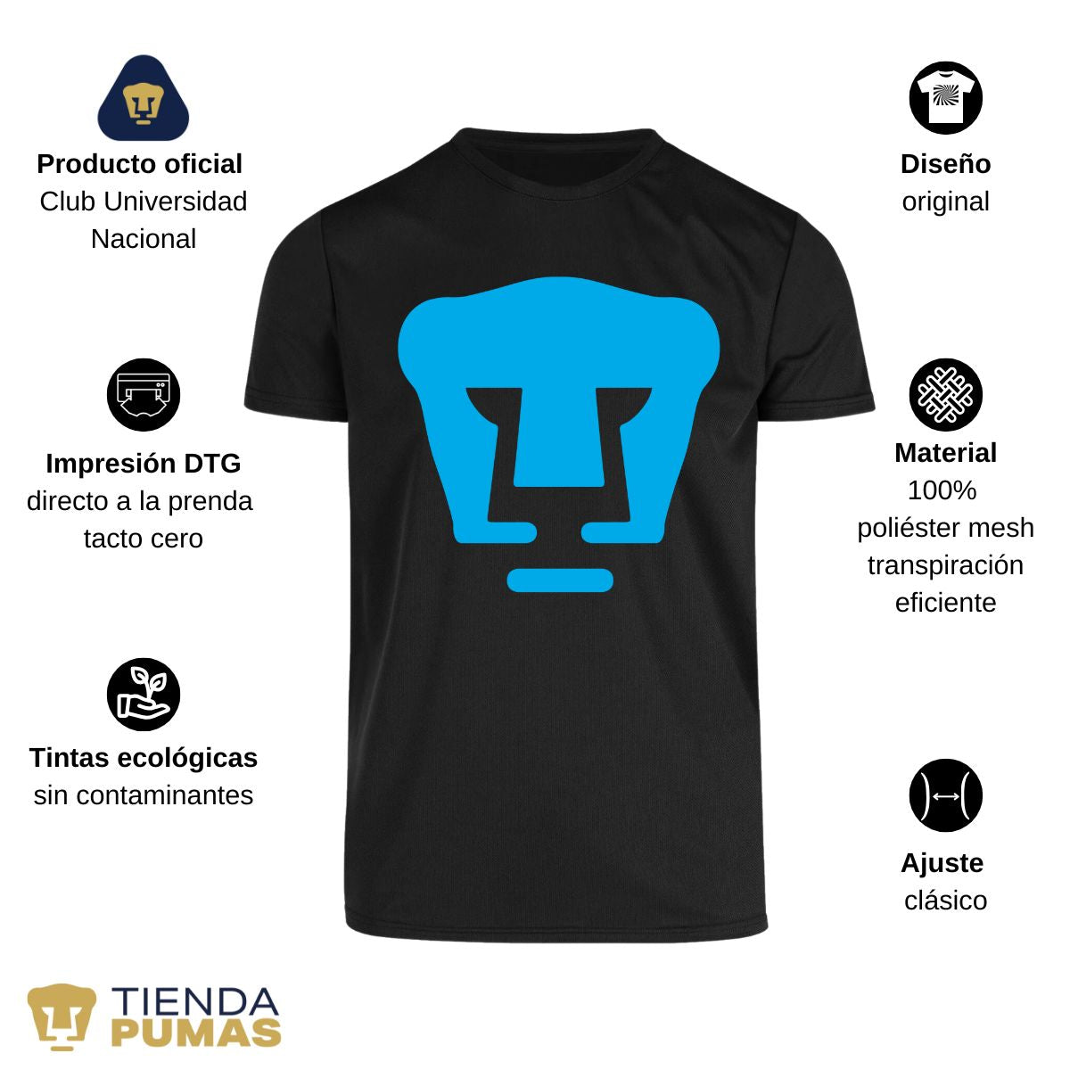 - ORIGINALIDAD Y SOSTENIBILIDAD: Playera transpirable de hombre manga corta. Producto Oficial con diseño original de Pumas UNAM impreso con tecnología DTG (directo a la prenda) tacto cero. Se utilizan tintas ecológicas sin contaminantes que se adhieren a las fibras de la ropa, garantizando calidad, colores vivos e imagen de larga duración en la camiseta sin comprometer el planeta. La playera cuenta además con etiqueta y holograma que garantiza un producto 100% original de Pumas UNAM.