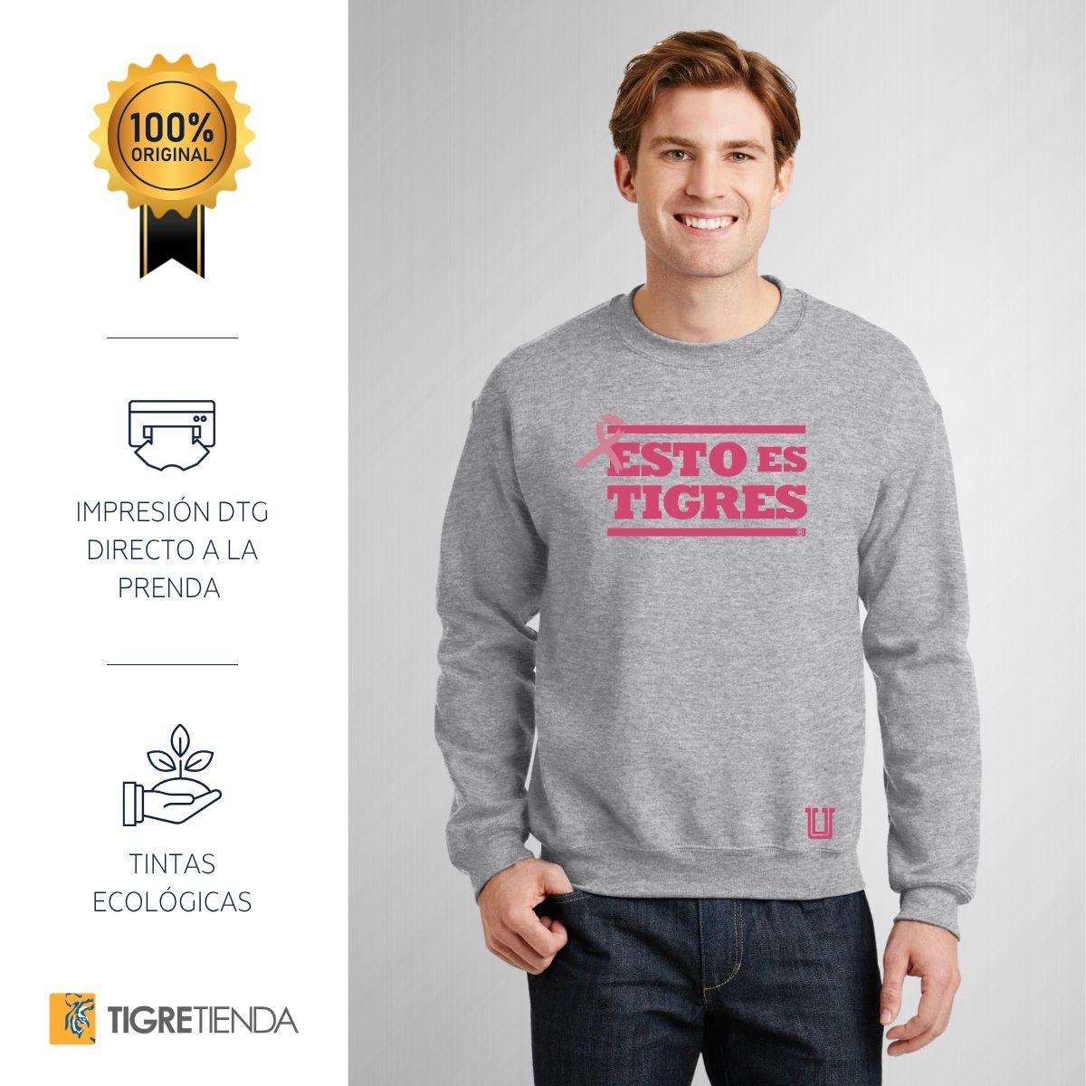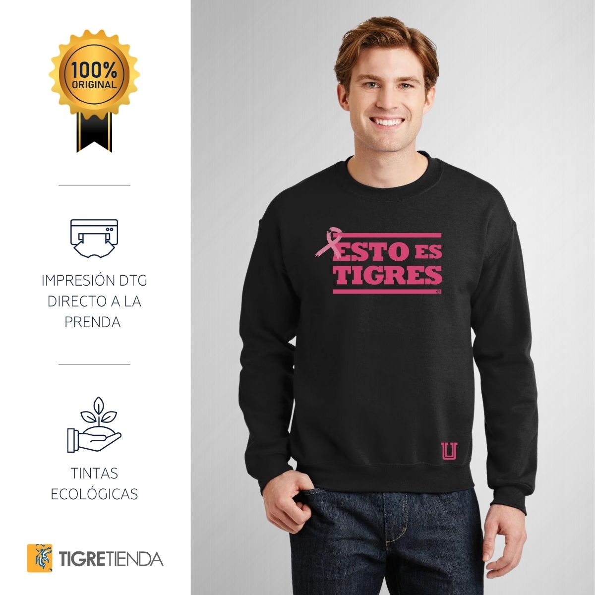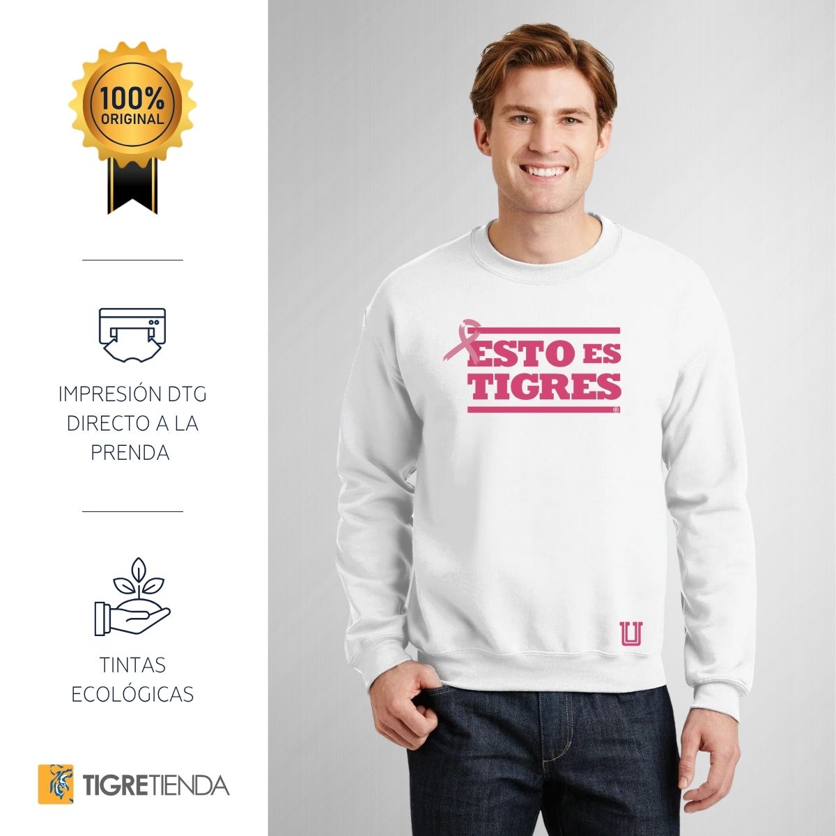 - ORIGINALIDAD Y SOSTENIBILIDAD: Sudadera de adulto cuello redondo sin gorro, Producto Oficial con un diseño original de Tigres UANL impreso con tecnología DTG (directo a la prenda) tacto cero. Se utilizan tintas ecológicas sin contaminantes que se adhieren a las fibras de la ropa, garantizando calidad, colores vivos e imagen de larga duración en la sudadera sin comprometer el planeta. La sudadera cuenta con etiqueta y holograma que garantiza un producto 100% original de Tigres.