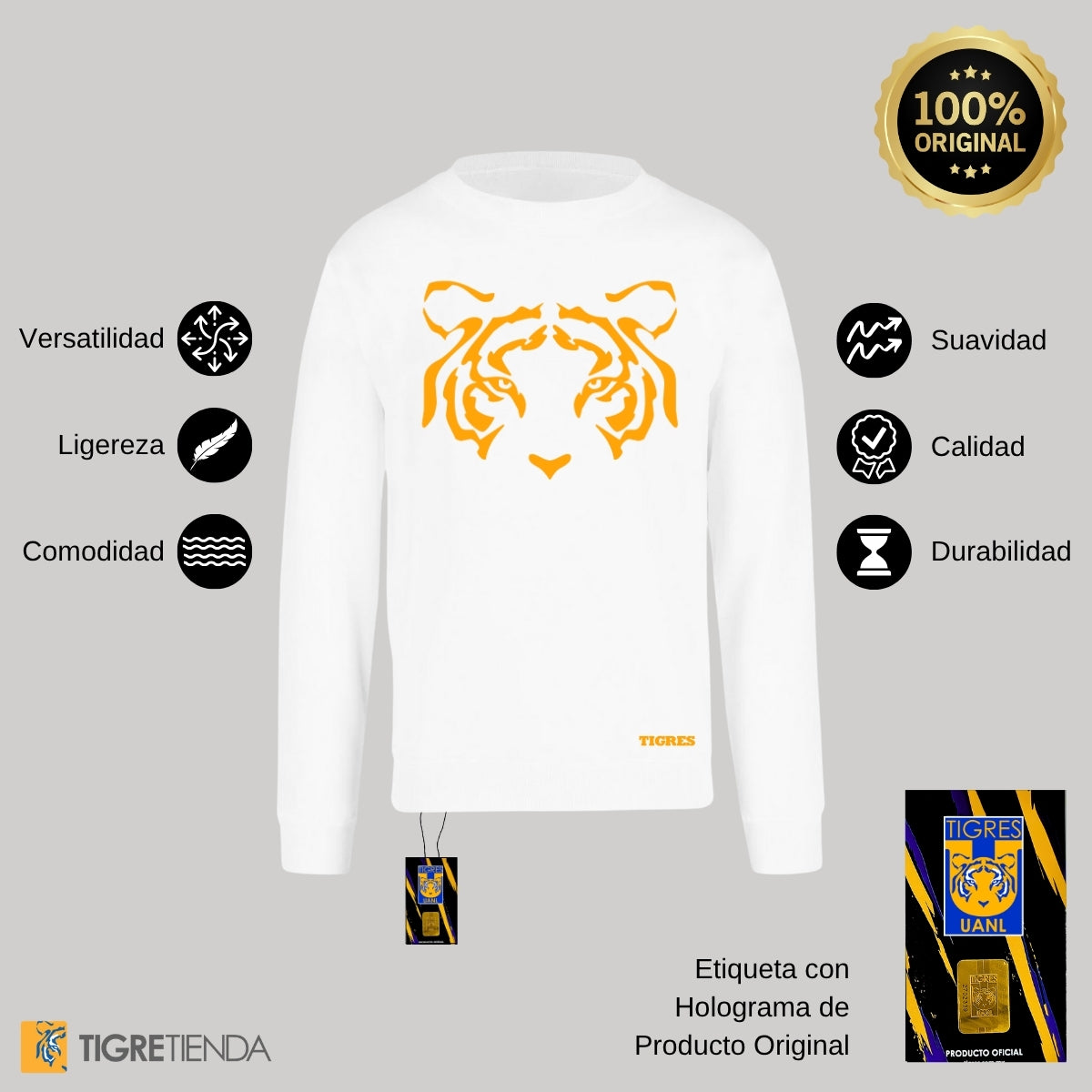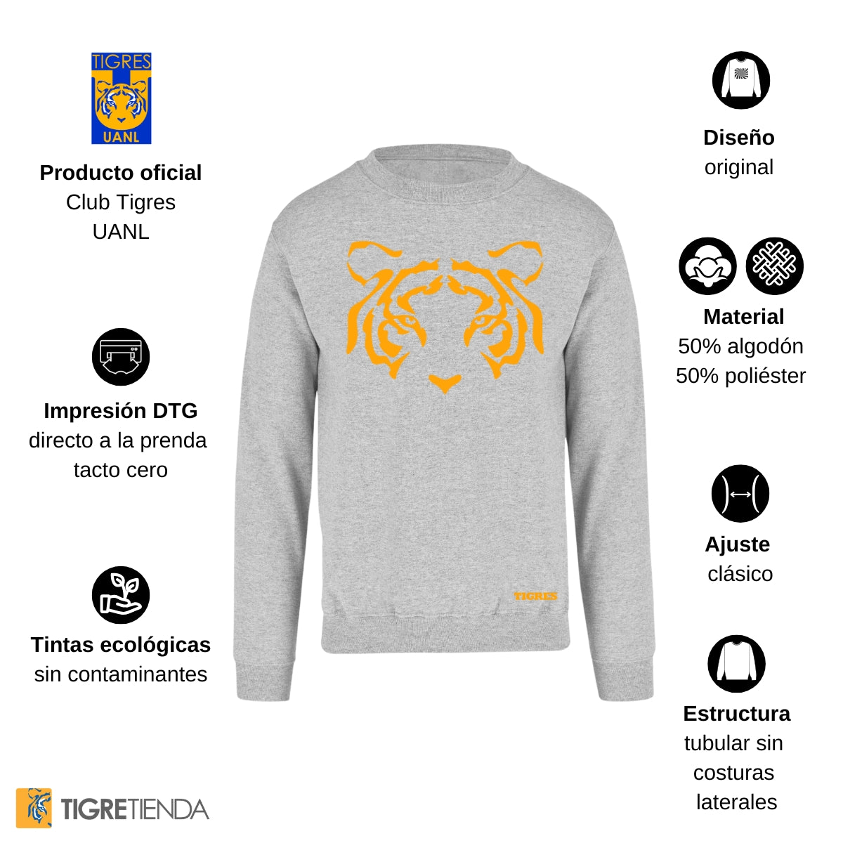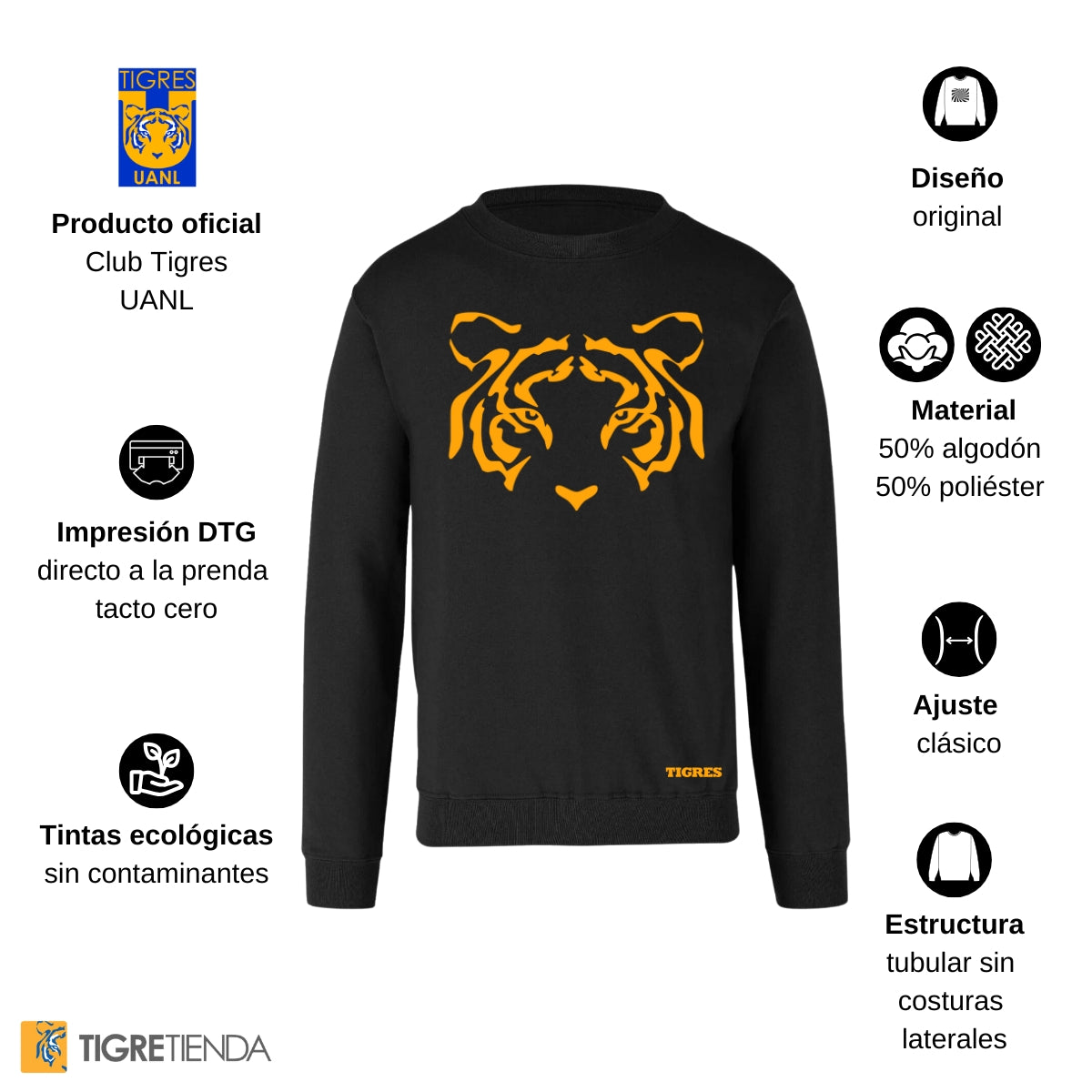 - ORIGINALIDAD Y SOSTENIBILIDAD: Sudadera de adulto cuello redondo sin gorro, Producto Oficial con un diseño original de Tigres UANL impreso con tecnología DTG (directo a la prenda) tacto cero. Se utilizan tintas ecológicas sin contaminantes que se adhieren a las fibras de la ropa, garantizando calidad, colores vivos e imagen de larga duración en la sudadera sin comprometer el planeta. La sudadera cuenta con etiqueta y holograma que garantiza un producto 100% original de Tigres.